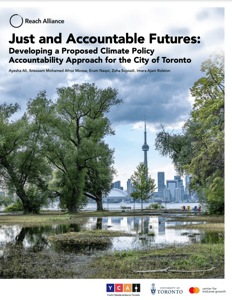 This report, Just and Accountable Futures: Developing a Proposed Climate Policy Accountability Approach for the City of Toronto, was completed by Ayesha Ali, Ibtesaam Mohamed Afroz Moosa, Erum Naqvi, Zoha Sojoudi, and Imara Ajani Rolston. In Toronto, Black and racialized youth, particularly those in neighbourhoods designated as Neighbourhood Improvement Areas (NIAs), face disproportionate impacts from climate change. Decades of systemic disinvestment and racial injustice have left these communities vulnerable to environmental hazards such as excessive heat, pollution, and flooding, with limited resources to respond. As the City of Toronto works to advance its climate goals through initiatives such as the TransformTO Net Zero Strategy, a gap remains in ensuring that these communities, particularly the youth, have a role in holding the City accountable for its climate promises.