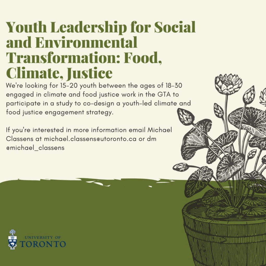 Between the fall of 2023 and spring of 2024 Cheyenne Sundance, Aden Fisher and Michael Classens held 6 knowledge co-creation workshops with youth in the Greater Toronto Area working at the intersection of food justice and climate justice. The Youth for Food-Climate Justice project was meant to bring youth together to imagine what a more just and sustainable local food system looks like, and to develop policy and program recommendations to get us there. This work was part of a broader initiative, Youth Climate Action in Toronto, a project supported by the City of Toronto and University of Toronto aimed at developing a strategy to support broader youth engagement in climate action as a part of the TransformTO Net Zero Strategy.